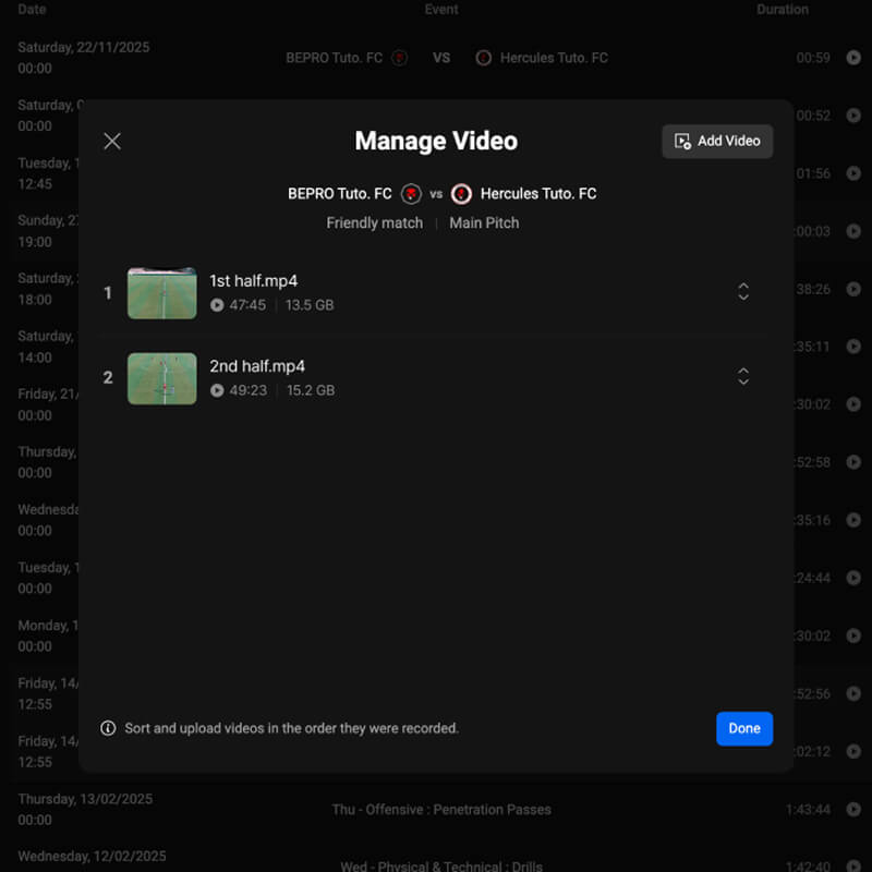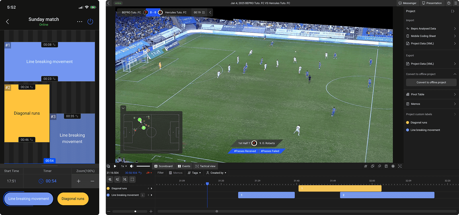 Code easily on-site with BEPRO mobile app, then load it with the video in BEPRO Editor after the match for deeper analysis.