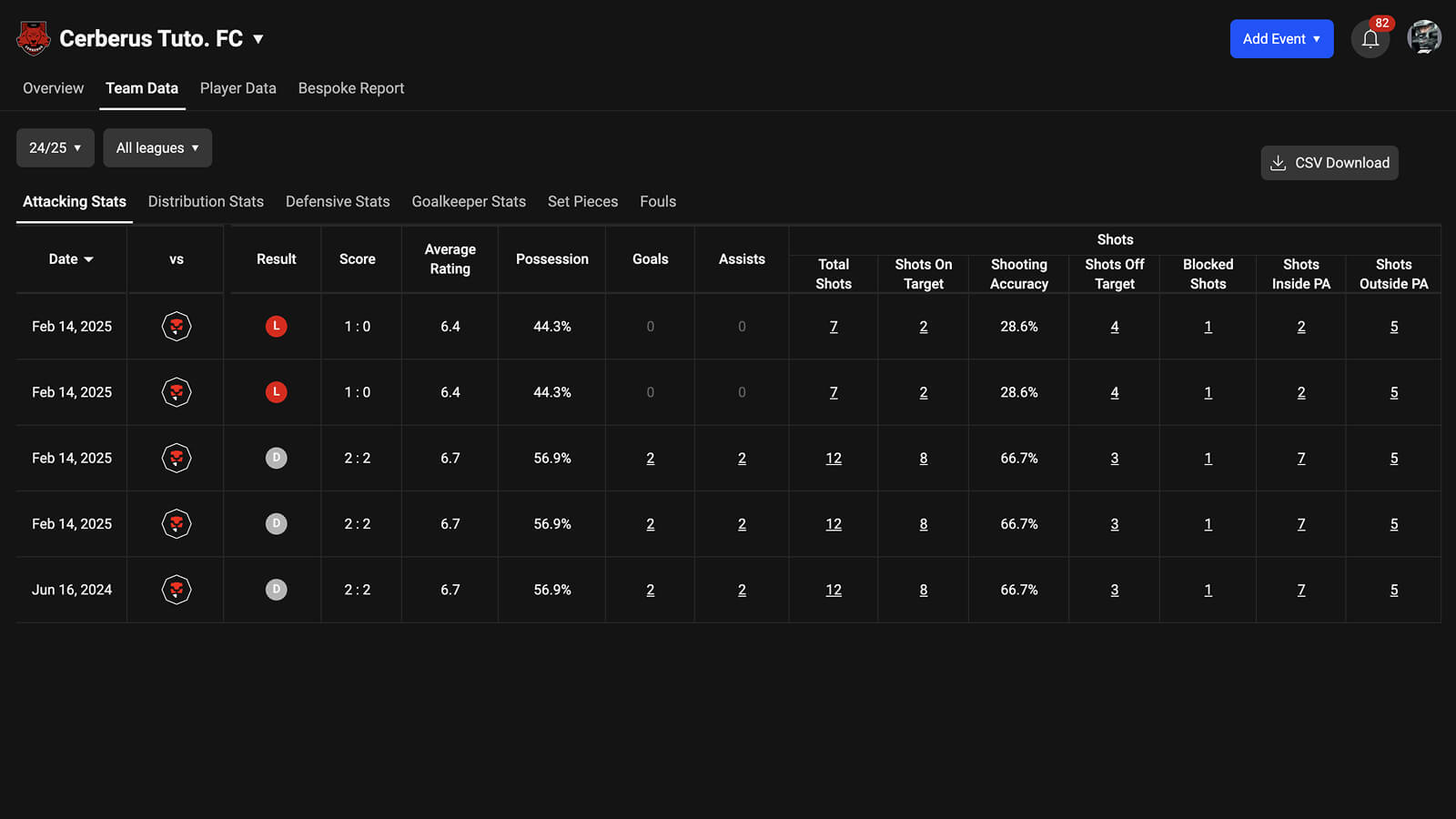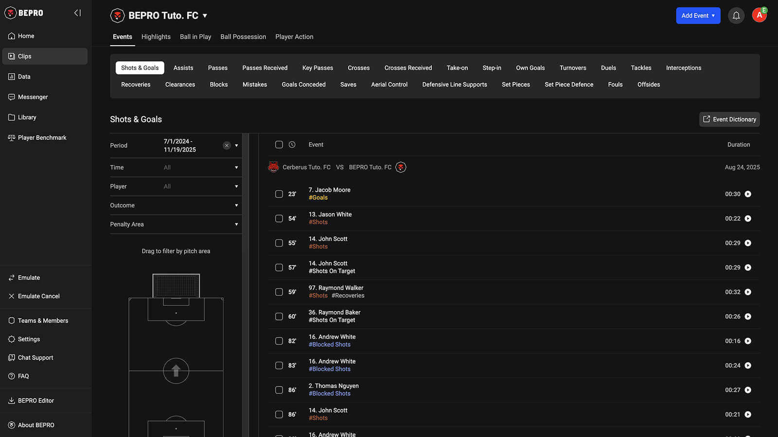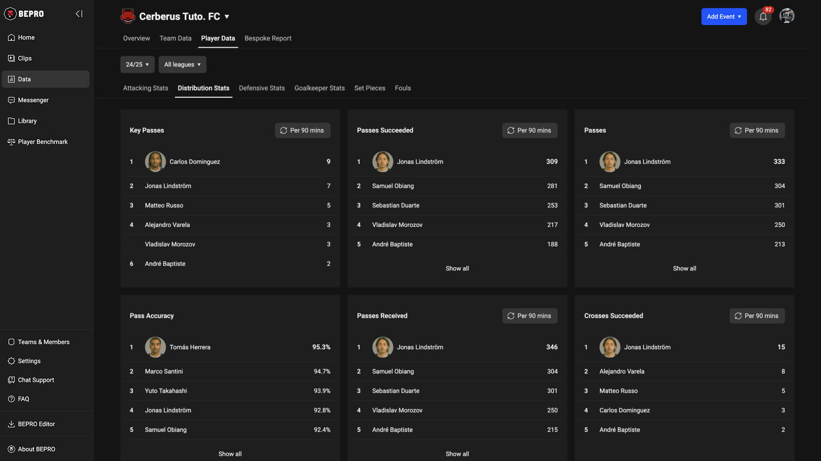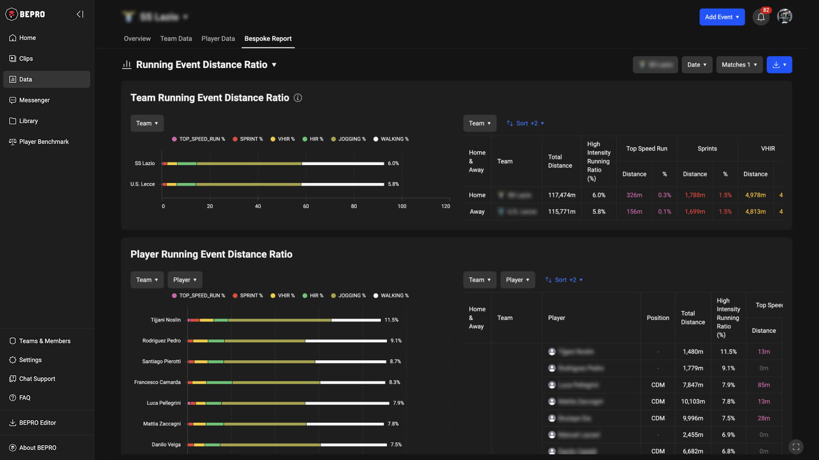 View and download team and player data, plus bespoke reports from BEPRO's analysis to derive strategic insights.
