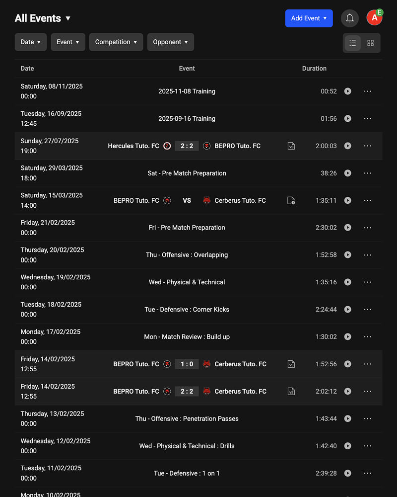 Easily find all team matches and training sessions using various filters including team, date range, competition, and match/training type.