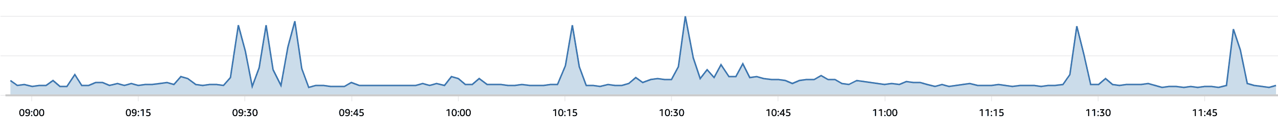 이것은 주말 동안 세 시간 동안 (매초 측정되는) 일반적인 API 호출 패턴입니다. 서버는 아주 짧은 시간 동안 평소 요청의 10배에서 20배를 처리합니다. 이것은 (경기 일정에 따라) 매우 불규칙합니다. 일반적인 상황에서는 비교적 적은 인프라 리소스로 이 트래픽을 처리하기에 충분하지만, 피크 시간대에 동일한 성능을 보장하기 위해 짧은 시간 동안 리소스는 스케일 아웃 또는 스케일 업되어야 합니다. 이러한 트래픽 패턴은 주말/주중 및 계절적/비계절적 기간에 따라 매우 불규칙합니다.