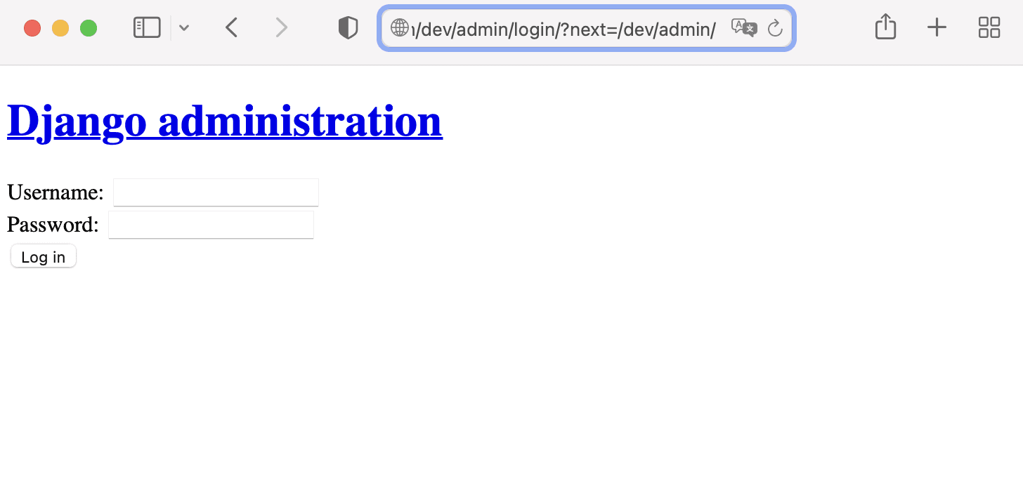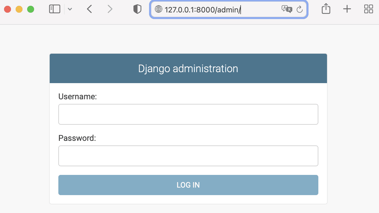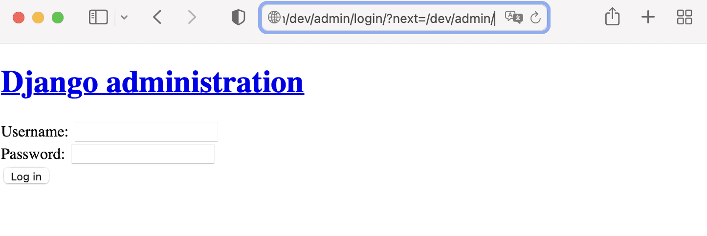 우리는 브라우저를 통해 로컬 Django 서버에 연결할 수 있습니다. (이 예시에서는 어떤 기능도 구현하지 않고, 단순히 Django 관리자 로그인 페이지에 접속하여 테스트할 것입니다.)