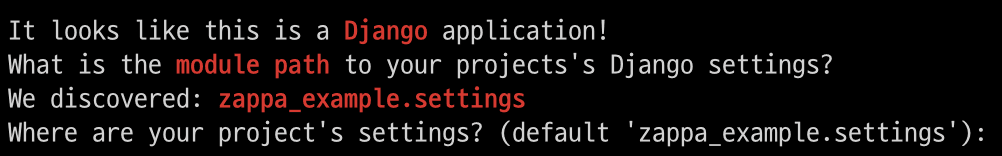 자파(Zappa) 설정의 대화형 모드로 들어갑니다. 저는 기본값으로 진행했습니다. 대화 중에 주목할 점은 자파(Zappa)가 저희 디렉토리가 Django 프로젝트임을 인식하고 자동으로 설정했다는 것입니다.