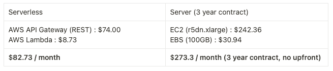 우리는 AWS 서버리스 환경이 약 70% 더 저렴하다는 것을 알 수 있습니다.