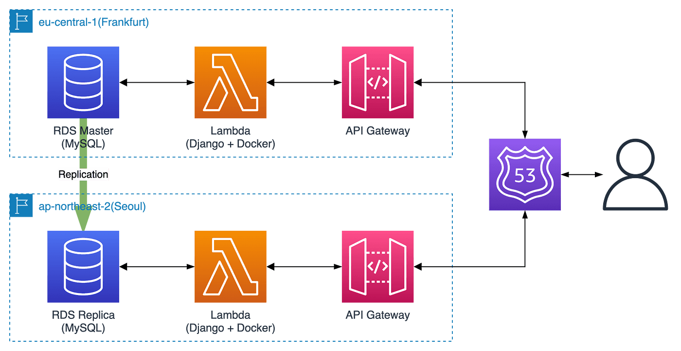 우리는 글로벌 서비스를 제공하기 위해 유럽과 아시아를 여러 지역으로 구성하여 API 응답 지연 시간을 최적화하려고 노력했습니다. 우리는 또한 도커 컨테이너를 사용하여 람다 환경을 배포했습니다. 이 모든 서버리스 관리는 오픈 소스 도구인 Zappa에 의해 이루어집니다.