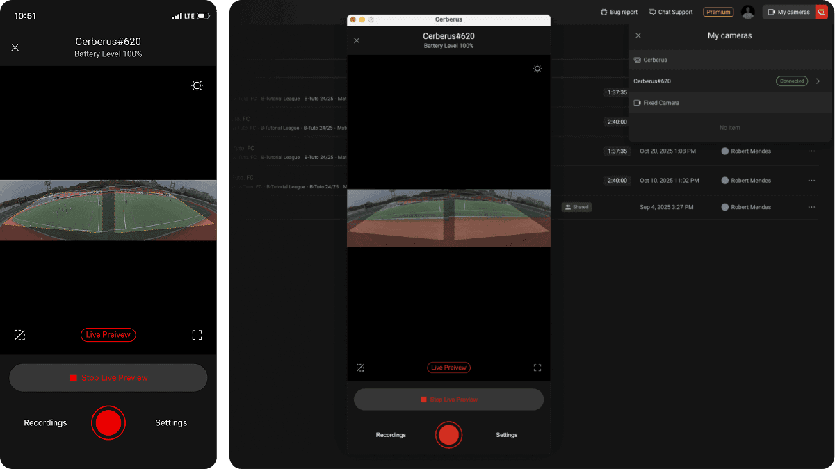 Connect to Cerberus WiFi from the BEPRO mobile app or BEPRO Editor, watch live preview, start recording, and upload your video to BEPRO Space.