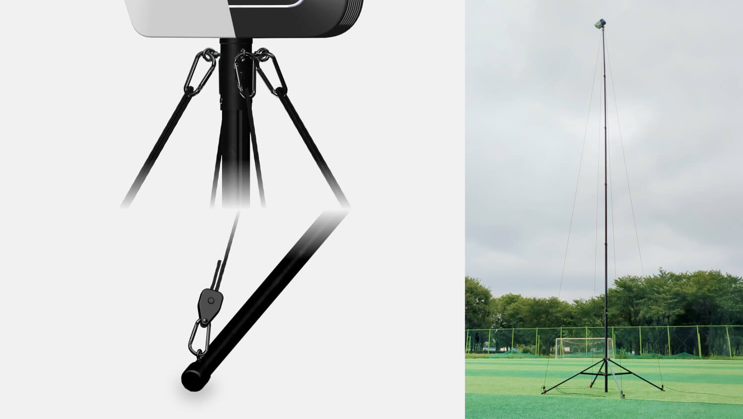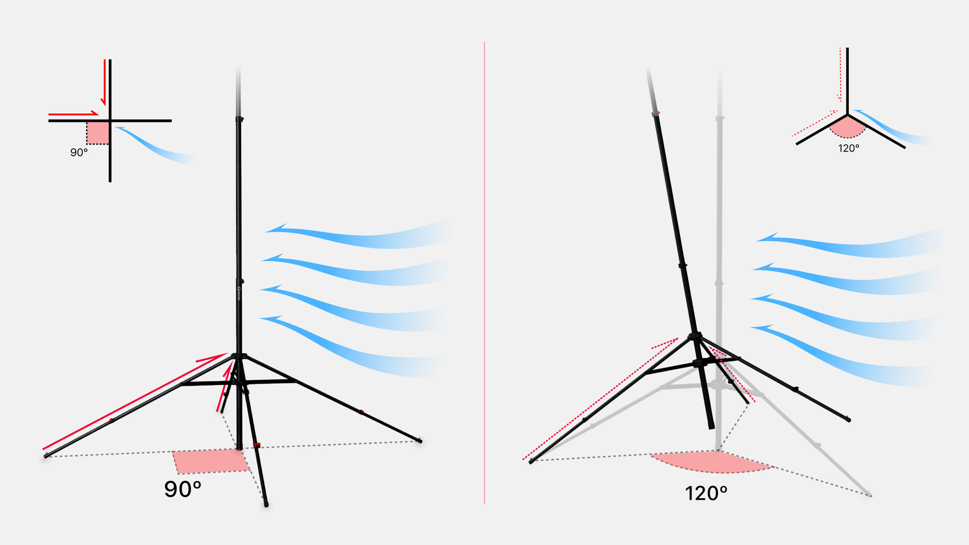 The four-legged design reduces the angle between the legs from 120° to 90° and has longer legs than those of a usual high-stand tripod, enhancing stability and balance.